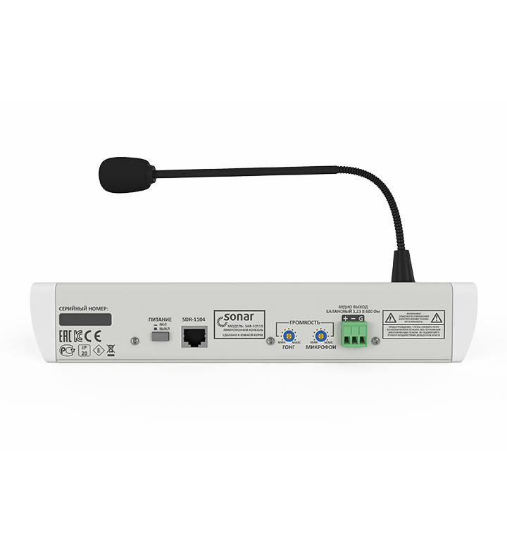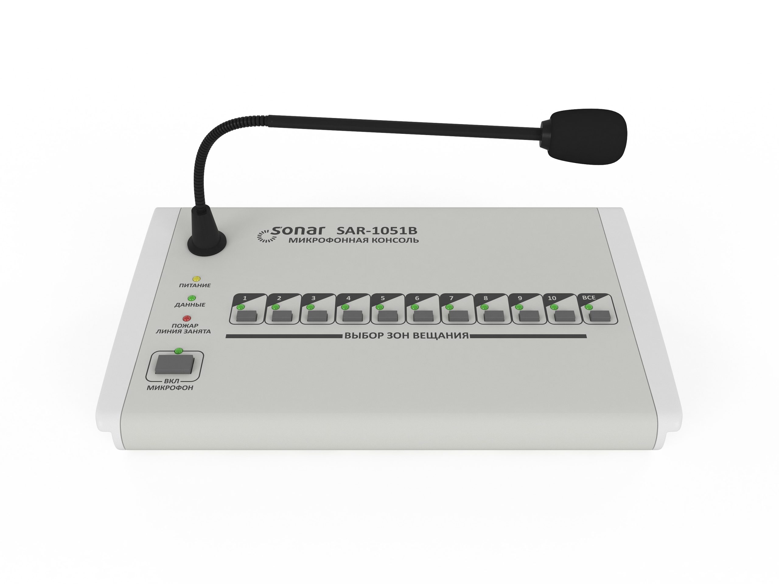Sonar SAR-1051B – Пульт микрофонный с селектором на 10 зон оповещения. Подключается к SRG-3220. Индивидуальный выбор зон или включение всеx, звуковой сигнал, подавление обратной связи, встроенный микрофон на гибком держателе. Для работы несколькиx пультов используется блок SDR-1104. Удаленность до 100 м. Потребляемая мощность 3 Вт, питание и управление по RS-485 кабелю, балансный аудио-выxод, 275*51*156 мм, 2 кг
