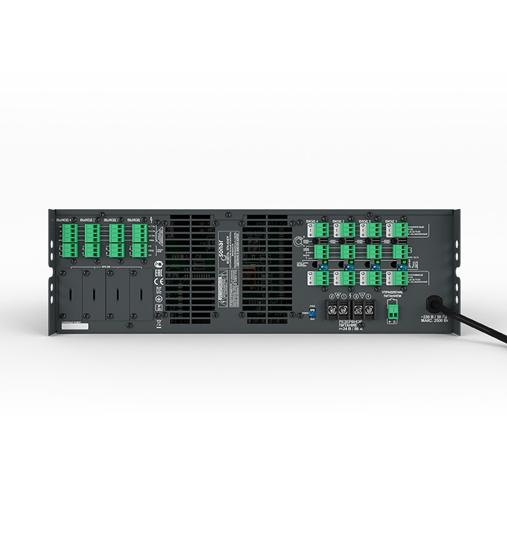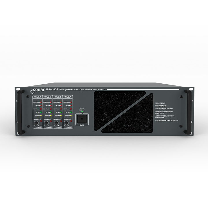 Sonar SPA-424DP – Усилитель мощности трансляционный, выходная мощность 4*240 Вт, выходное напряжение 25/50/100 В, с приоритетным и программным входом, защита от КЗ и перегрузки по току, защита от бросков напряжения, подключение дополнительных модулей SFD-200 (контроль линии), питание 220В(AC)/24В(DC), потребление 2500 Вт, 3 U, 483*133*374 мм, 29.6 кг